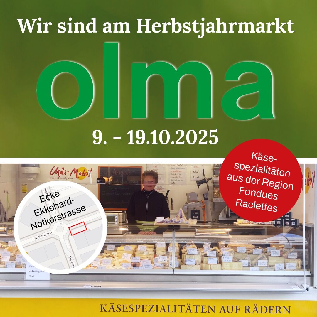 VOM 9. BIS 19. OKTOBER SIND WIR AM HERBSTJAHRMARKT DER OLMA (EKKEHARD- / NOTKERSTRASSE) - BESUCHEN SIE UNS DORT. DIE ANDEREN STANDORTE WERDEN IN DIESER ZEIT NICHT BEDIENT.