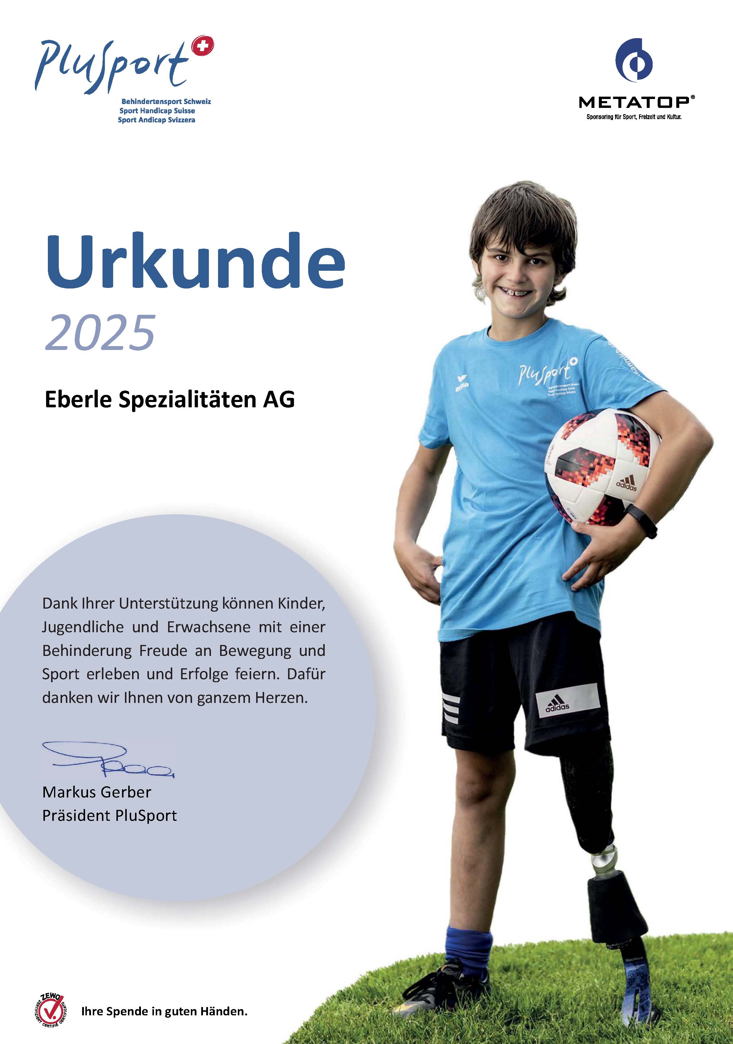Mit viel Freude unterstützt Eberle Spezialitäten auch im kommenden Jahr den Behindertensport. Dank dem Dachverband PluSport Behindertensport Schweiz werden schweizweit über 80 Mitgliederclubs gestärkt und der Zugang für den Nachwuchs zum Breiten- und Spitzensport ermöglicht.